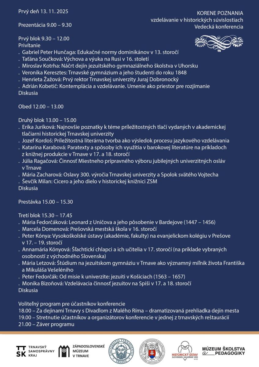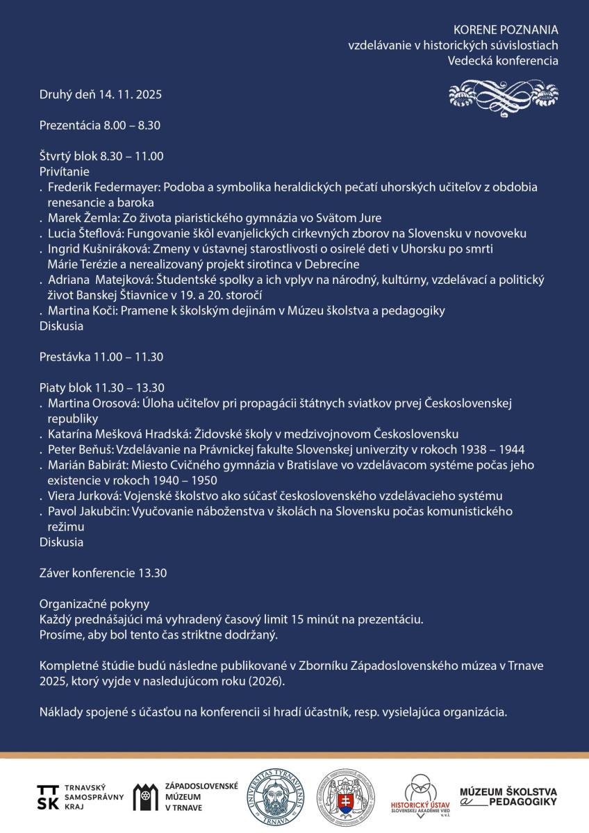 srdečne Vás pozývame na vedeckú konferenciu s názvom "Korene poznania - vzdelávanie v historických súvislostiach", ktorá sa uskutoční 13. až 14. novembra 2025 v koncertnej sále Západoslovenského múzea v Trnave, Múzejné námestie 3.