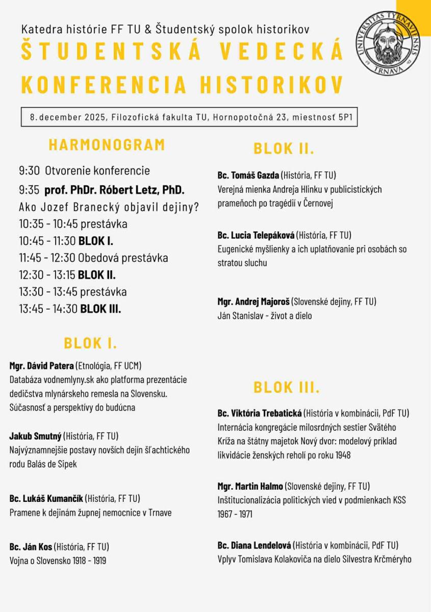 Tešiť sa môžete na úvodnú prednášku pozvaného hosťa, prof. Róberta Letza z Katedra histórie a didaktiky dejepisu PdF UK Bratislava, ako aj na príspevky našich študentov histórie a učiteľstva dejepisu a tiež doktorandov z našej katedry a z UCM v Trnave.